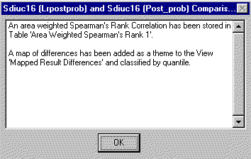 When processing is complete, the location of the table containing the Spearman's rank correlation coefficient and the name of the view containing the map of rank differences is reported: